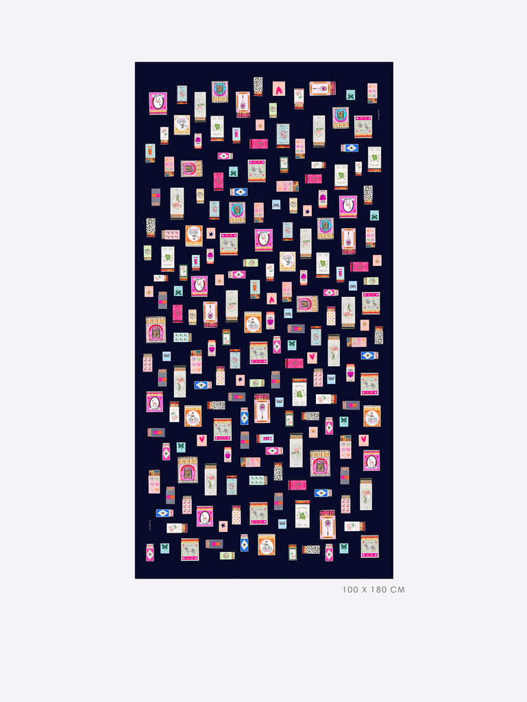 Square silk scarf measuring 110 × 110 cm. Printed with illustrated matchboxes in various colors...