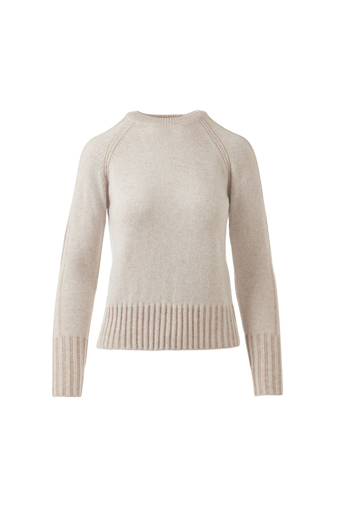 Crewneck sweater with long raglan sleeves. Rib detail at seams, down sleeves, and hem and cuffs. Available in Pearl/Taupe.