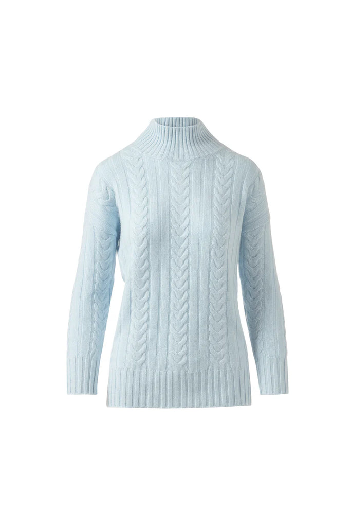 Long sleeve cable detail sweater with rib trim at funnel neck and cuffs. Available in Ice blue.