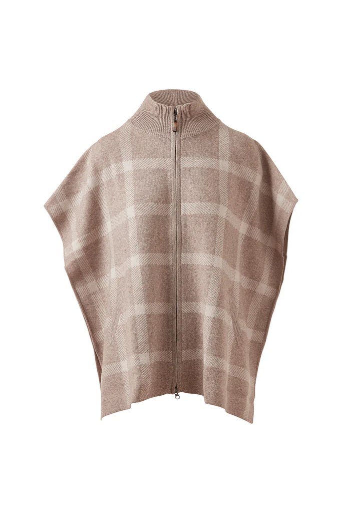 Mock neck topper with a zip up the front and drapey cap sleeve. Available in Black Plaid and Taupe Plaid.