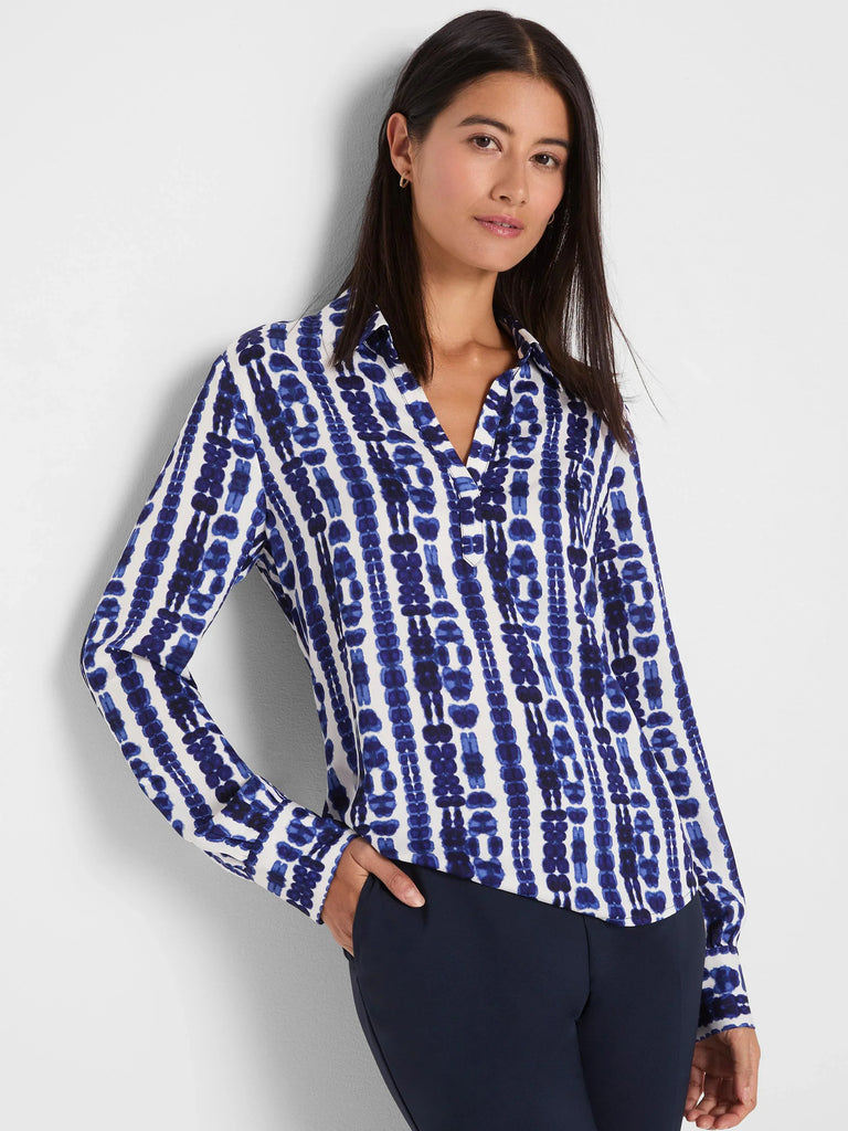 Inspired by the Japanese art of Shibori dyeing, this lightweight top brings the ancient technique into your modern wardrobe. The clean pullover design with a V-neck and classic shirt collar gets a reverse stripe at the cuff to add a little more interest. With a regular fit and sits at hip.