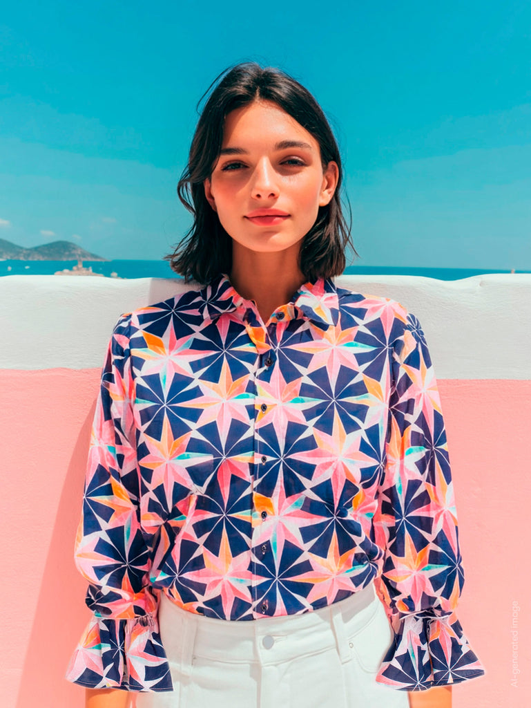 Long sleeve button front shirt in Capri print with multi color plaid and multi motif...
