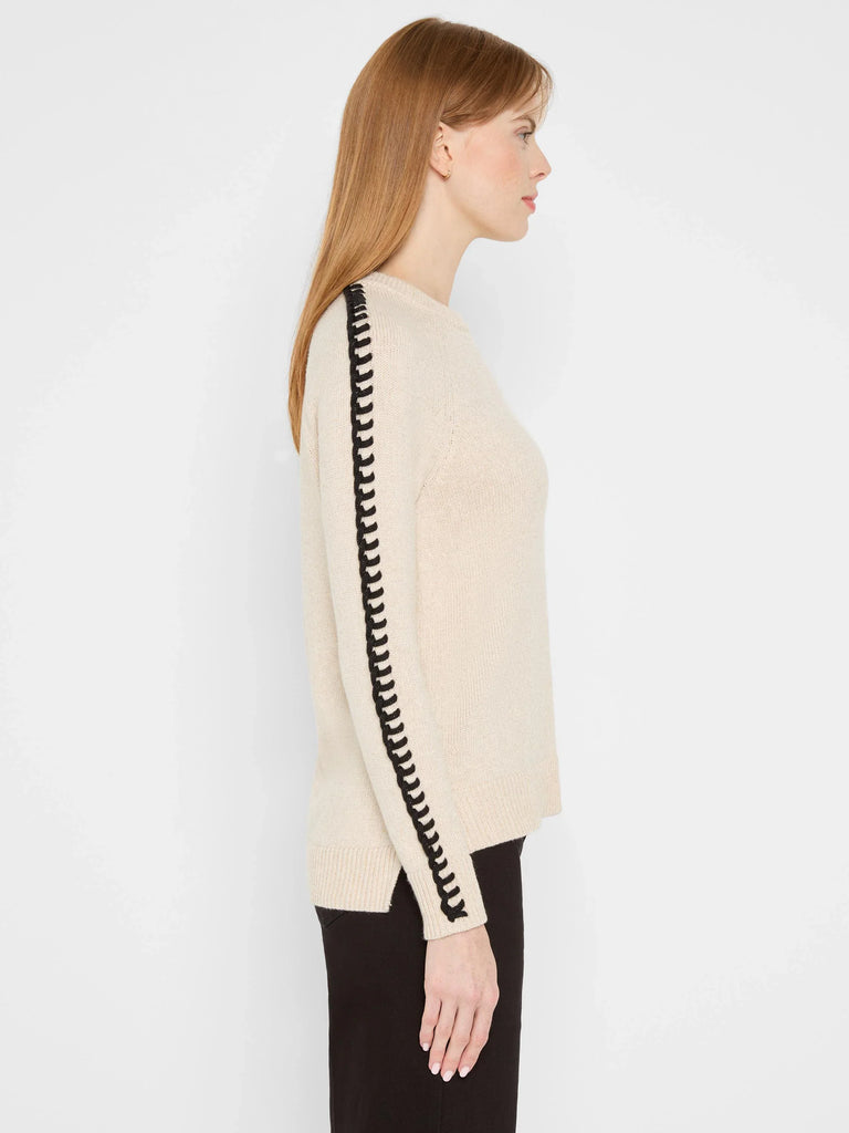 Our fan-favorite Dashing Down sweater, but with the extra special detail of metallic yarn woven directly in. An effortless to way to shine at any occasion. An easy pullover that adds a little extra to the everyday look thanks to the whipstitch detailing up the sleeves, and placed white stripes on the cuff. Made from a plied-up version of our super soft Zephyr yarn for a comfy, effortless feel. We gave it an easy fit, a round neck, and raglan sleeve to create a more feminine shape. The hi/low hem sits at the hip and offers extra coverage in the back.