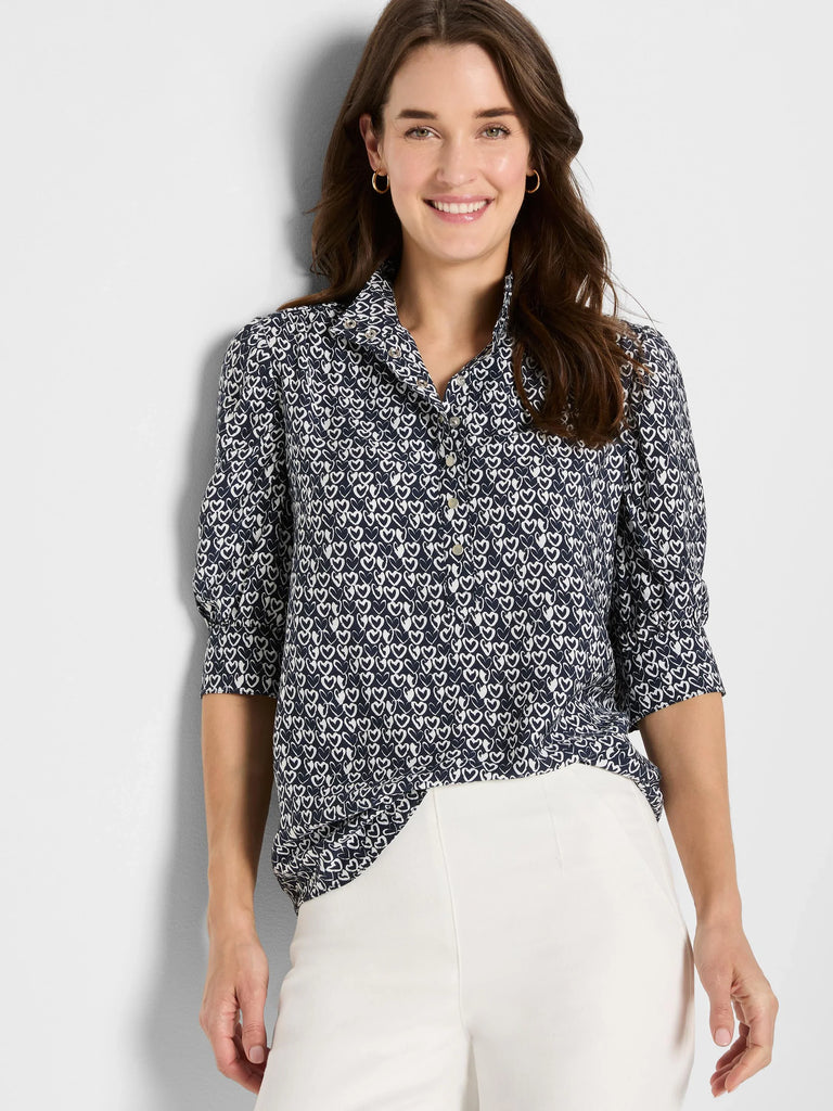 Give wearing your heart on your sleeve a whole new meaning. The bi-color design pops with a unique high-volume short sleeve and deep button placket. Designed to be drapey, smooth, and effortless. A stand collar and button front with a regular fit and sits at hip. Available in Navy.
