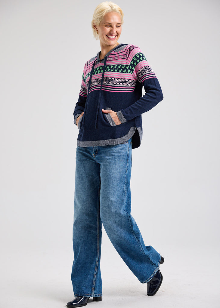 Long sleeve pullover hoody with front pocket. Intarsia fairisle pattern at top. Stripe trim at cuffs, pocket, and hem. Available in Denim and Charcoal.