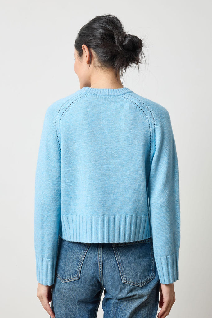 The saddle sleeves, wide rib trims, and relaxed body make this sweater a fresh update to a classic pullover. Delicate pointelle stitching along the sleeves and around the armholes adds an extra special touch. Designed to hit at the high hip, this style is as refined as it is cozy. Length: 21". Available in Mystic Blue.