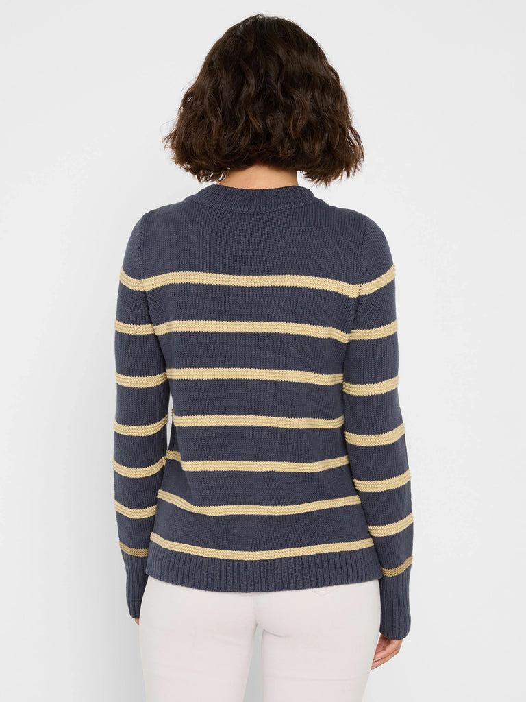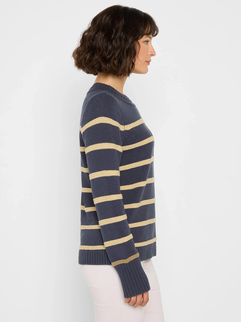 Because every closet should have at least one "when in doubt" style. In timeless stripes that never go out of style. She may look easy and effortless at first glance but look closer and discover elevated details like plied up cotton for extra coziness, rib cuffs and hem, a subtly new crewneck silhouette, and detailing around the built-up neck that uses three different knit techniques. Available in Grey and Navy.